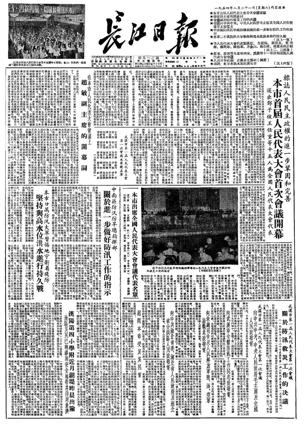 1954年8月21日,《长江日报》头版刊登武汉市首届人民代表大会开幕消息。