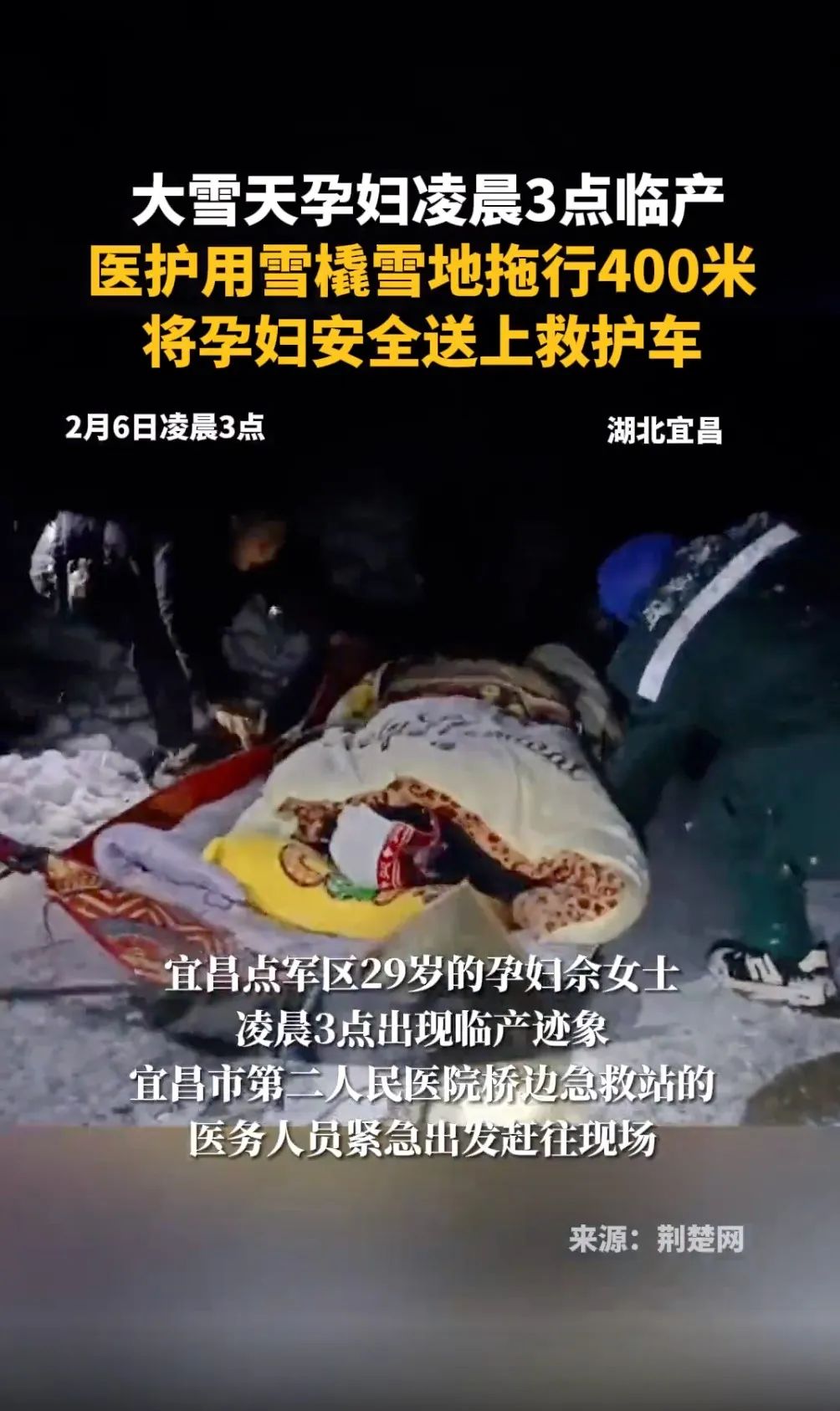 当天17时30分,得知佘女士成功诞下一女后,荆楚网微信迅速发布《凌晨3点!最后400米,用“雪橇”拖!》。稿件次日被人民日报微信头条转发,再次引发刷屏现象。
