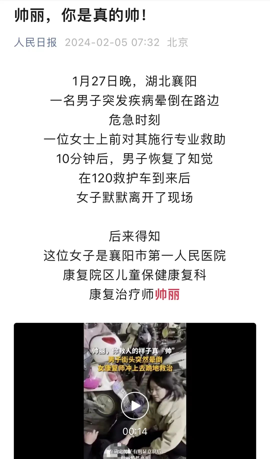 在荆楚网被人民日报微信等中央媒体转发的稿件中,短视频成为稿件出圈的关键。如《陶守武,你被拍下来了!》,通过15秒短视频聚焦湖北黄冈红安县交警陶守武飞奔开道救人的画面;如《帅丽,你是真的帅!》,通过14秒短视频还原湖北襄阳康复治疗师帅丽街头救人的现场……