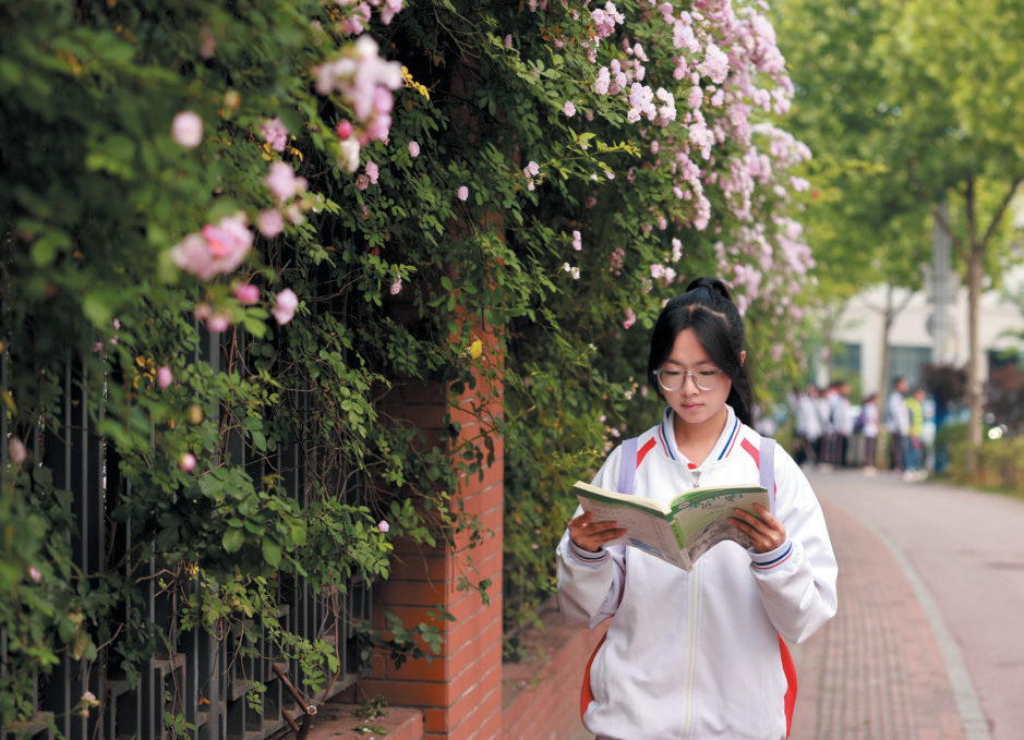 蔷薇花墙立高中,少女捧书思无穷。记者刘旻摄