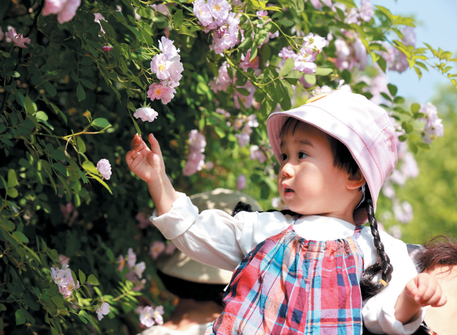 蔷薇花间稚子乐,小手轻点花飘落。记者刘旻摄