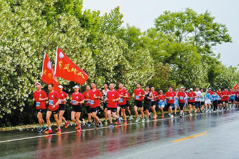5月26日,我市长跑运动协会开展庆寻根节健康长跑活动。当天,我市近200名长跑健身爱好者参加了从随州博物馆广场到炎帝故里风景名胜区全长18公里的长跑活动。图为长跑健身爱好者正冒雨跑在炎帝大道上。 (随州日报全媒记者李文军、通讯员高建新摄)