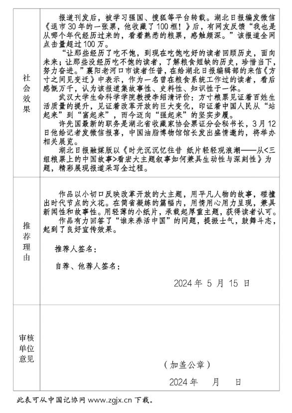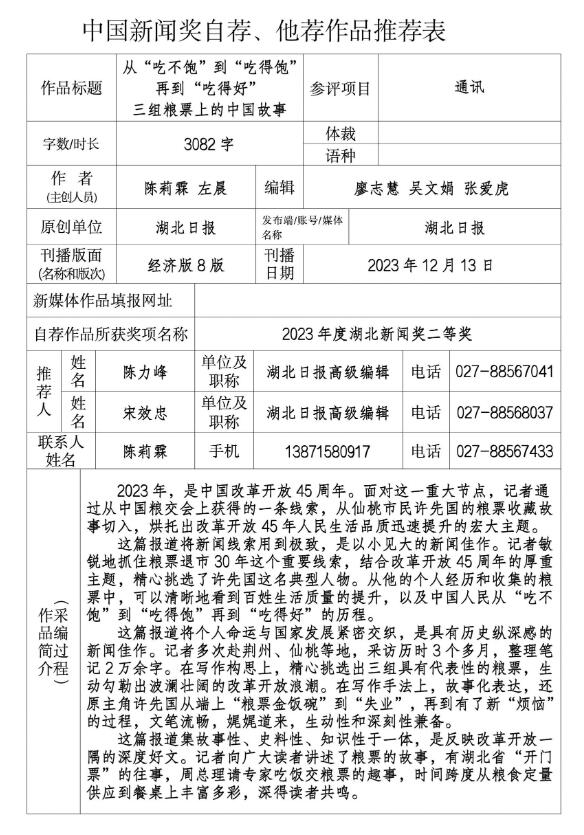 《湖北日报》2023年12月13日刊发的通讯《从“吃不饱”到“吃得饱”再到“吃得好”三组粮票上的中国故事》,拟自荐参评第三十四届中国新闻奖作品初评,现予以公示。公示期为2024年5月27日至2024年5月31日,如有异议,可以通过电话、传真或电子邮件等方式于5月31日17时前反映,逾期不再受理。
