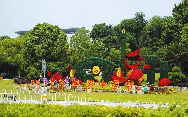 为以靓丽的城市形象迎接寻根节,5月下旬,市城管执法委组织白云公园等相关单位,在随州城区迎宾大道、白云大道、高铁南站、府河大桥等道路和点位,悬挂道旗,摆花布景,全面营造喜庆祥和、洁净优美的节日环境。图为园林工人正在市政府北坡摆花布景。 (随州日报通讯员聂少峰摄)
