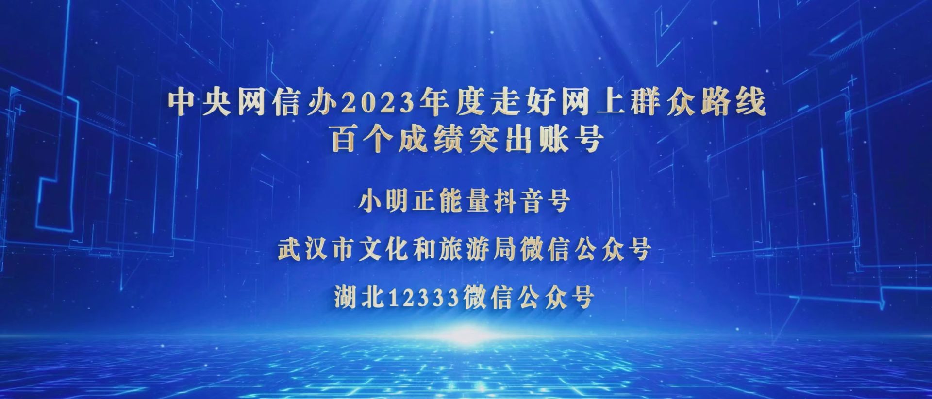 由中央网信办主办的“2023年走好网上群众路线百个成绩突出账号推选活动”中,湖北有三个账号获奖,分别是小明正能量抖音号、武汉市文化和旅游局微信公众号、湖北12333微信公众号。