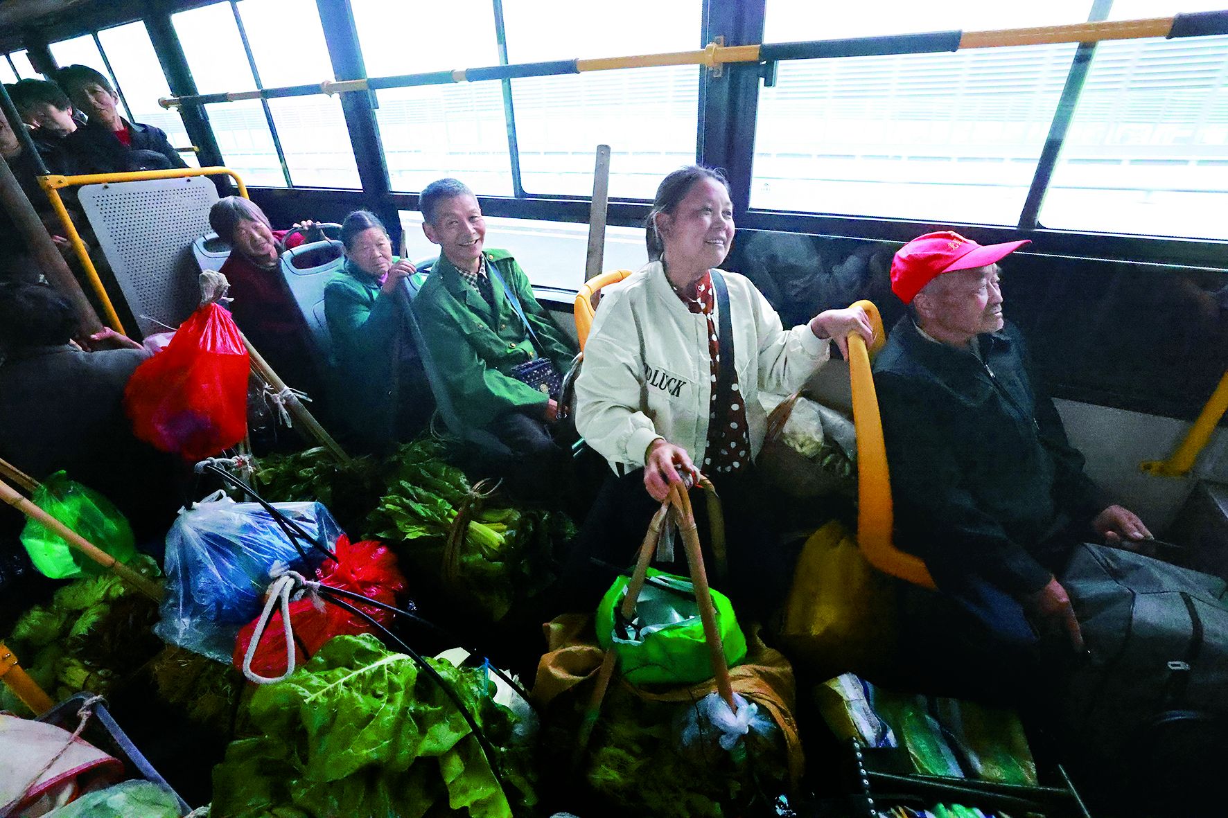 B513路“菜农专车”上,车厢过道被菜篮、菜筐塞得满满当当。记者王昌明 摄