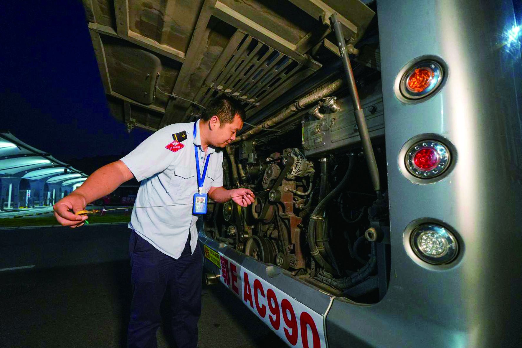 凌晨,513路公交司机王云在发车前检查车况。 记者付蓓蓓 摄