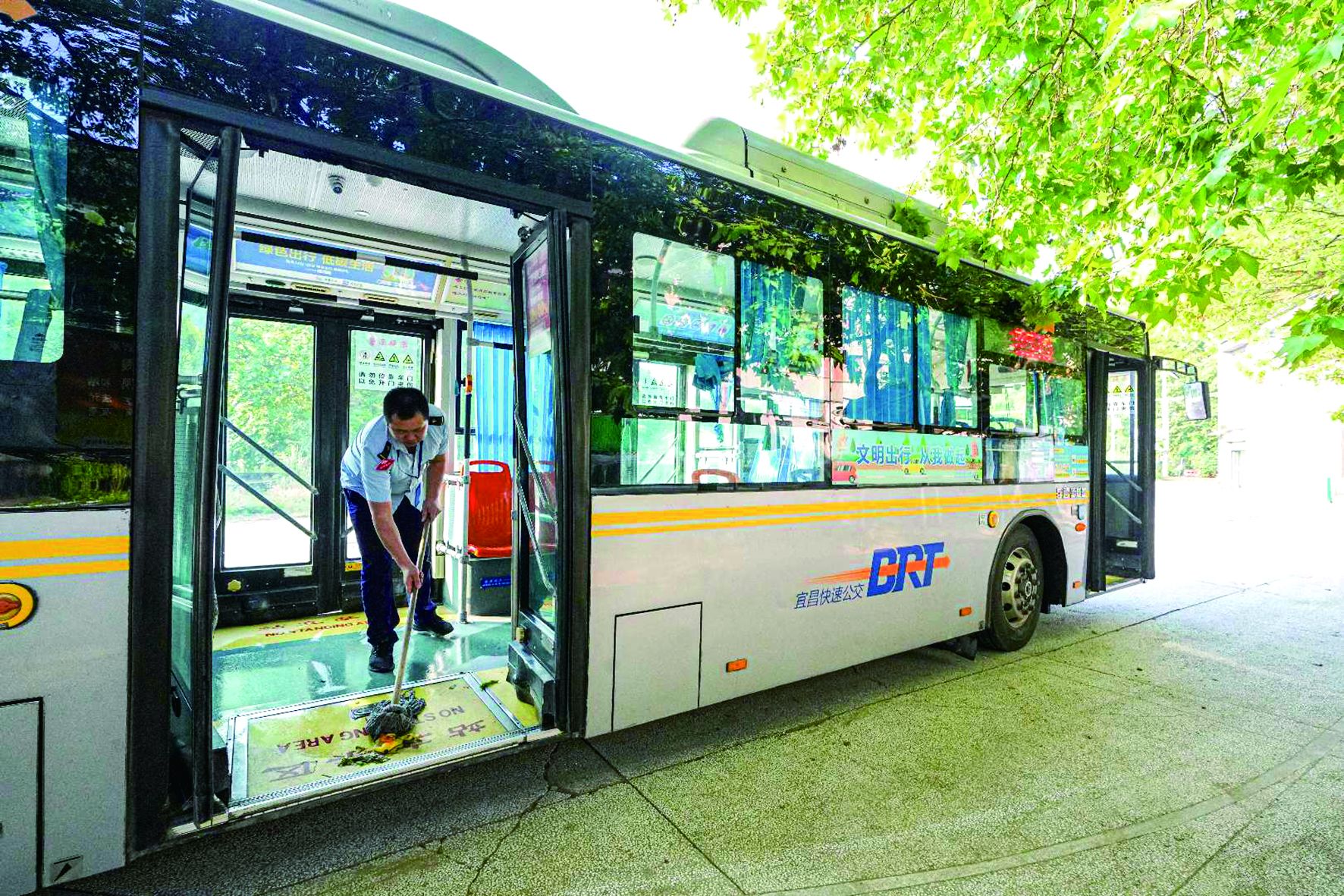 送完乘客,王云拿出拖把开始清理车厢,保证车辆干净整洁。记者付蓓蓓 摄