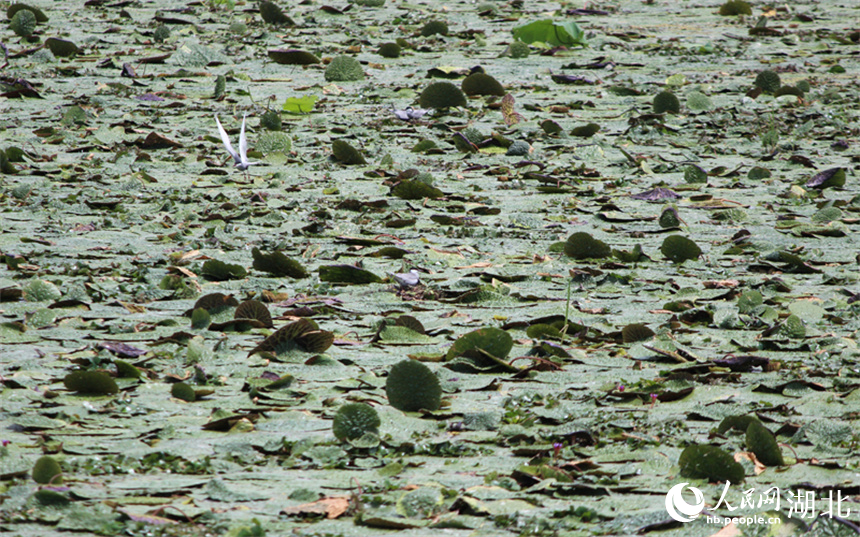 湖北孝感老观湖国家湿地公园,芡实叶盖满湖面,为须浮鸥等夏候鸟提供栖息场所。人民网记者 张沛摄