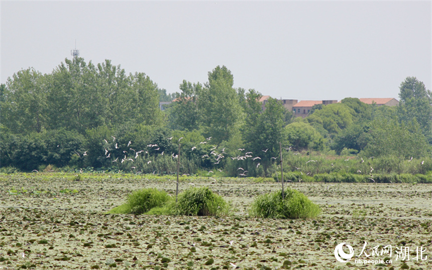 位于汉江下游北岸的湖北孝感老观湖国家湿地公园,水生植物茂盛,吸引了数万只须浮鸥、水雉等夏候鸟来此繁衍生息,场面蔚为壮观。