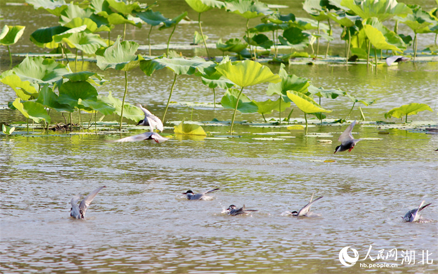 湖北天门张家湖国家湿地公园,须浮鸥在水面嬉戏。人民网记者 张沛摄