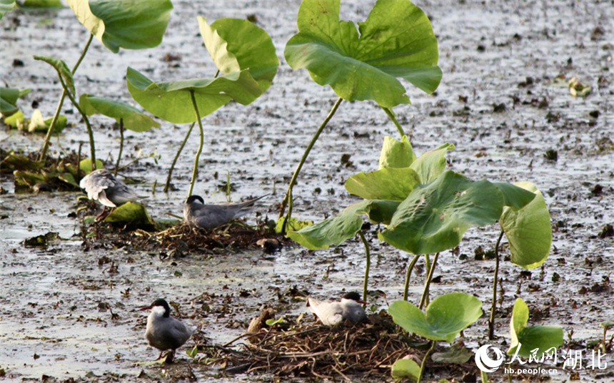 湖北天门张家湖国家湿地公园,须浮鸥在荷叶下筑巢。人民网记者 张沛摄