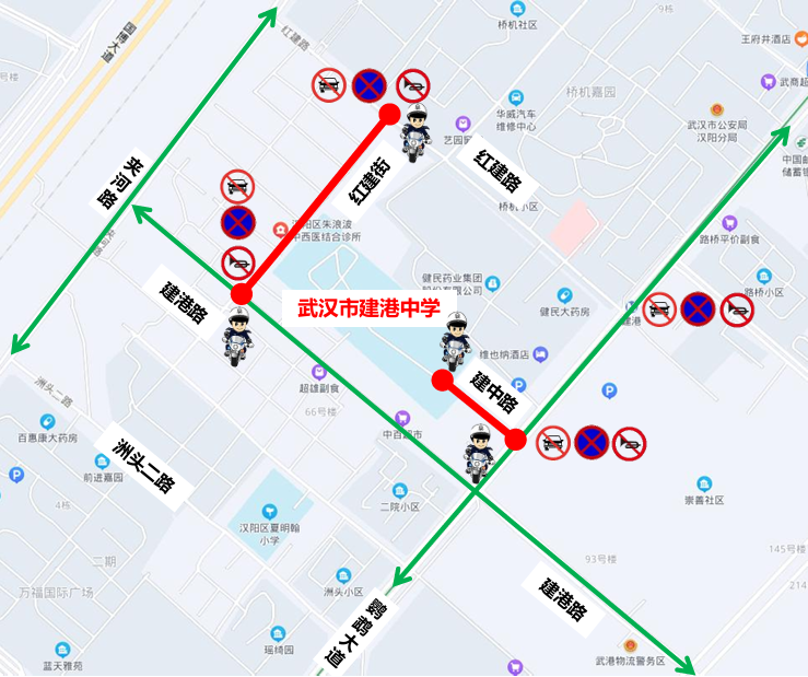 武汉市晴川高级中学周边临时交通管控示意图四、武汉市建港中学:6月7日、8日、9日7时至18时40分,建中路、红建街禁止车辆停放、鸣笛。6月8日英语听力考试期间(14时45分至15时30分),建中路、红建街禁止机动车通行。汉阳交警提醒:考生可乘坐地铁6号线至建港站D出口或乘坐公交61路、524路、558路、580路、704路等线路至鹦鹉大道地铁建港站下车。