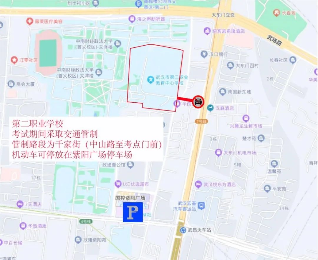 武汉市东湖中学周边临时交通管控示意图六、武汉市第二职业教育中心学校:6月7日—9日每日上午考试前2小时至当日考试结束,千家街中山路至考点门前路段限行。送考车辆可经张之洞路或中山路进入千家街后到达考点,车停至张之洞路(千家街路口至首义路口)沿线单排依次有序停放。考生及家长还可乘地铁4号线或7号线至武昌火车站站,从G1口步行约900米抵达考点。