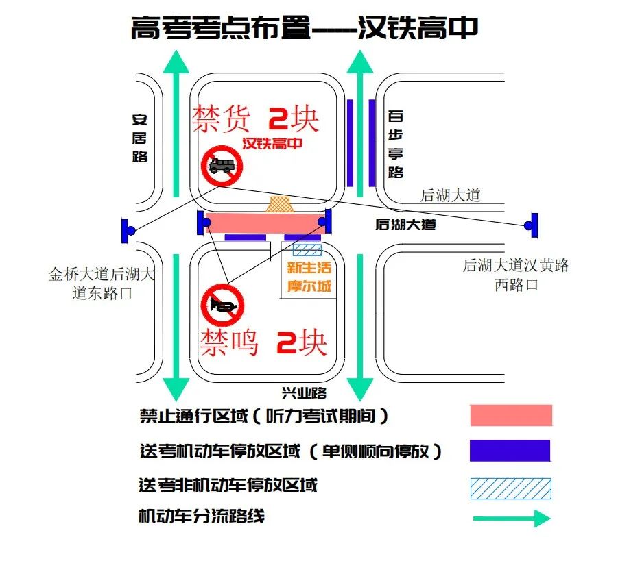 武汉市第六高级中学周边临时交通管控示意图三、武汉市汉铁高级中学:后湖大道(安居路至百步亭路)听力考试期间禁止通行,建议绕行安居路、百步亭路、兴业路、后湖南路。后湖大道塔子湖西路口、后湖大道塔子湖东路口需按指示标牌绕行。江岸交警建议送考家长及考生乘坐地铁21号线至百步亭花园路站后步行至考点。