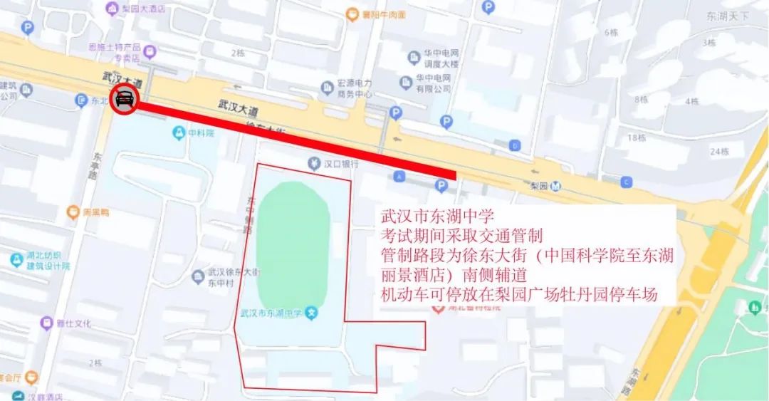 武汉市第十五中学周边临时交通管控示意图五、武汉市东湖中学:6月7日—9日每日上午考试前2小时至当日考试结束,考点门前道路禁止车辆停放。送考车辆可经中北路或东湖路进入徐东大街后到达考点,车停至东亭路、梨园广场牡丹园停车场。考生及家长还可乘地铁8号线至梨园站,从A口步行约317米抵达考点。