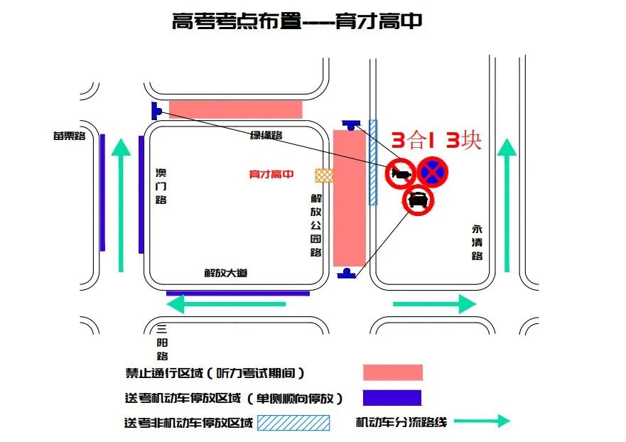武汉市汉铁高级中学周边临时交通管控示意图四、武汉市育才高级中学:解放公园路(绿缘路至解放大道)、绿缘路(澳门路至解放公园路)听力考试期间禁止通行,建议绕行永清路、澳门路、解放大道;绿缘路澳门路口禁停、禁鸣、禁行。江岸交警建议送考家长及考生选择地铁1号线或8号线至黄浦路站往解放公园路方向出口步行至考点。