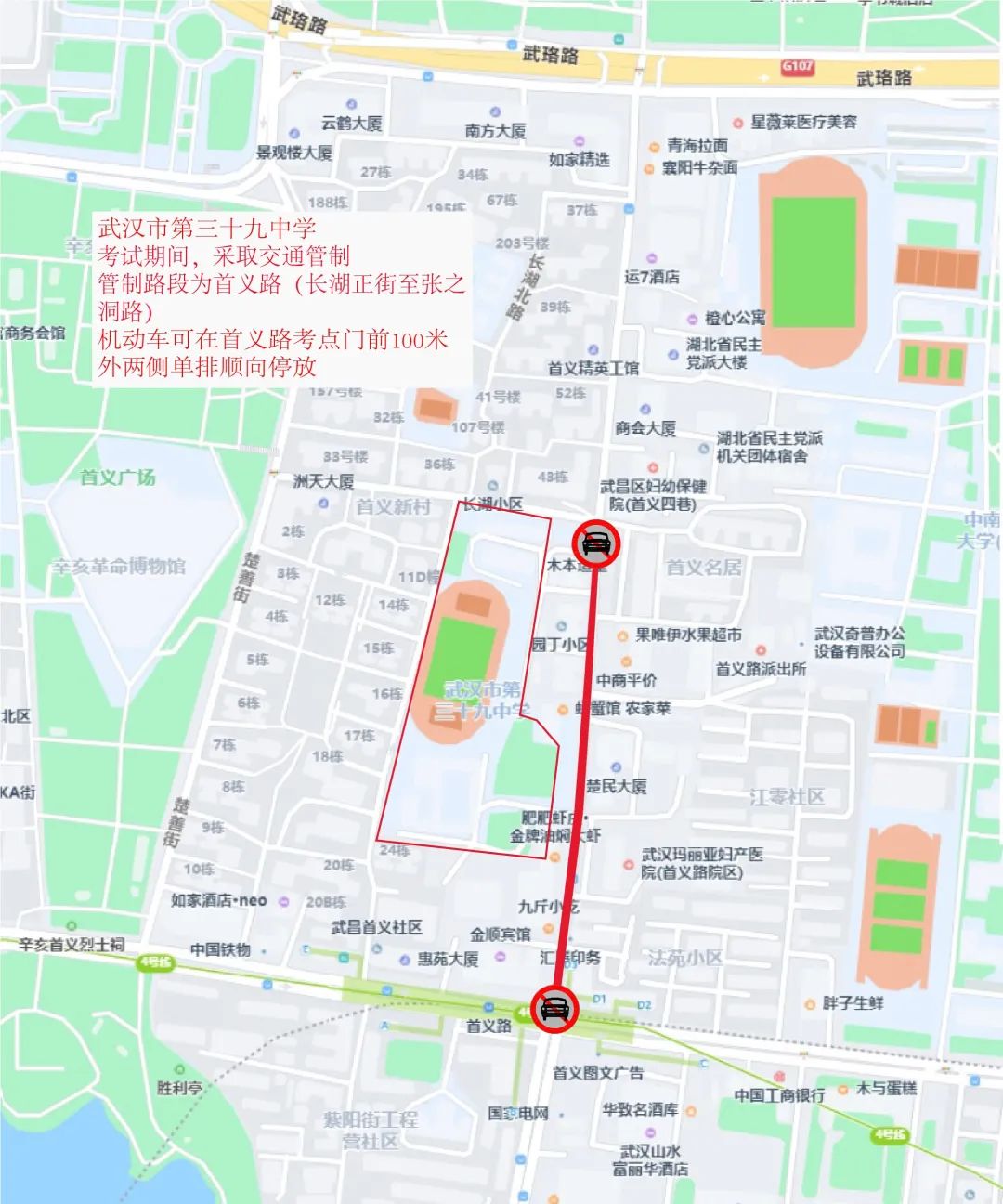 武汉市第二职业教育中心学校周边临时交通管控示意图七、武汉市第三十九中学:6月7日—9日每日上午考试前2小时至当日考试结束,首义路(长湖正街至张之洞路)限行。送考车辆可经武珞路进入首义路到达考点,或经张之洞路、楚善街、长湖正街至首义路到达考点,车停至首义路考点门前100米外两侧单排顺向停放。考生及家长还可乘地铁4号线至首义路站,从D3口步行约280米抵达考点。