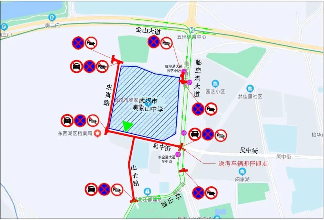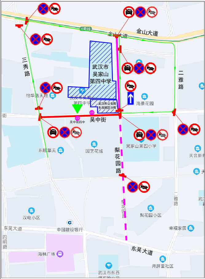 吴家山中学周边临时交通管控示意图二、吴家山第四中学:6月7日—9日,每日7:00—19:00,吴中街(梨花园路至三秀路)禁止机动车停放,并视情进行管控;每日7:00—9:00、16:30—18:30,梨花园路(吴中街至金山大道)实行机动车由南向北单向通行;每日7:00—19:00,吴中街、三秀路(金山大道至吴中街)、二雅路(金山大道至吴中街)、梨花园路(金山大道至吴中街)、金山大道(二雅路至三秀路)禁止机动车停放(停车泊位除外)、鸣笛。