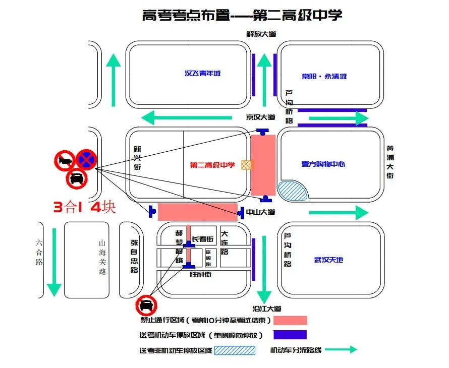 武汉市第二中学周边临时交通管控示意图今年该考点交通管制措施与往年有所区别:原分流路线张自忠路(中山大道至沿江大道)因施工,改为向六合路(中山大道至沿江大道)分流;中山大道(芦沟桥路至黄浦大街)因电力施工,取消两侧临时停车区域。二、武汉市第六中学:球场路(光华路至湖边坊路)每日考前十分钟至考试结束禁止通行,建议绕行澳门路、香港路、光华路、金门路;光华路(澳门路至球场路)、湖边坊路(澳门路至球场路)临时改为自西向东单向通行;湖边坊路澳门路口、光华路澳门路口禁停、禁鸣、禁行。江岸交警建议送考家长及考生乘坐地铁6号线至苗栗路站后下车步行前往考点。