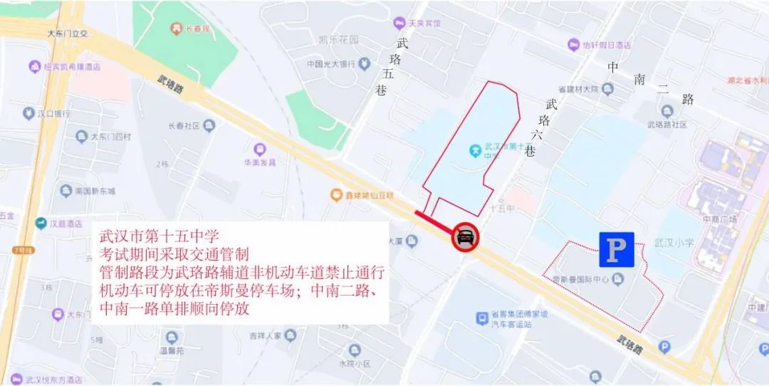 武汉中学周边临时交通管控示意图四、武汉市第十五中学:6月7日—9日每日上午考试前2小时至当日考试结束,考点门前武珞路辅道、非机动车道禁止通行。送考车辆可经武珞路或中南二路、中南一路、武珞路五巷、武珞路六巷后到达考点,车停至帝斯曼、中南二路、中南一路单排顺向停放。考生及家长还可乘地铁4号线至中南路站,从B口步行约795米抵达考点。