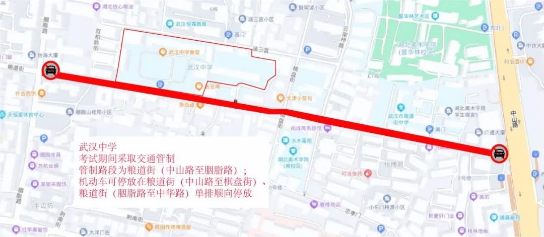 武汉市第十四中学周边临时交通管控示意图三、武汉中学:6月7日—9日每日上午考试前2小时至当日考试结束,粮道街(中山路至胭脂路)限行。送考车辆可经解放路或胭脂路进入粮道街(单向通行)后到达考点,车停至粮道街(中山路至棋盘街路口)、粮道街(胭脂路口至中华路口)单排顺向停放。考生及家长还可乘地铁7号线至小东门站,从A口步行约778米抵达考点。