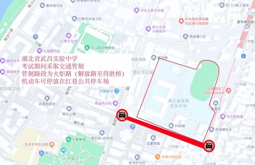 一、湖北省武昌实验中学:6月7日—9日每日上午考试前2小时至当日考试结束,火炬路(解放路至得胜桥)限行。武昌交警建议送考车辆经中华路或临江大道进入解放路后到达考点,可停放在红巷公共停车场。考生及家长还可乘地铁5号线到司门口黄鹤楼站后,从C出口步行约651米抵达考点。