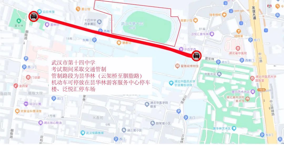 湖北省武昌实验中学周边临时交通管控示意图二、武汉市第十四中学:6月7日—9日每日上午考试前2小时至当日考试结束,昙华林(云架桥至胭脂路)限行。送考车辆可经中山路进入昙华林(单向通行)后到达考点,车停至泛悦汇停车场。考生及家长还可乘地铁2号线或7号线至螃蟹岬站,从E口步行约658米抵达考点。