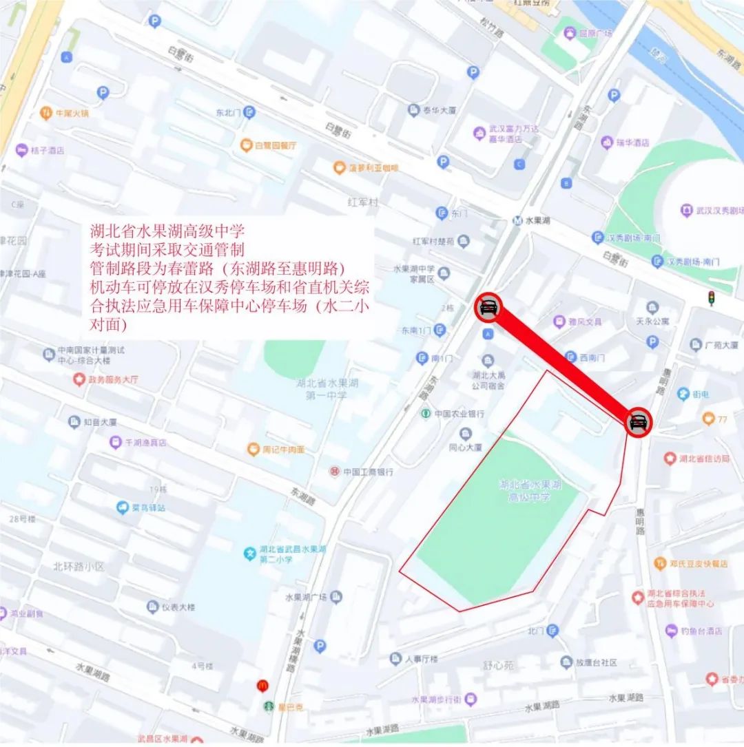 武汉市第三十九中学周边临时交通管控示意图八、湖北省水果湖高级中学:6月7日—9日每日上午考试前2小时至当日考试结束,春蕾路(东湖路至惠明路)限行。送考车辆可经惠明路进入春蕾路口后到达考点,车停至汉秀停车场、省直机关综合执法应急用车保障中心停车场(水二小对面)。考生及家长还可乘地铁8号线至水果湖站,从A口步行约427米抵达考点。