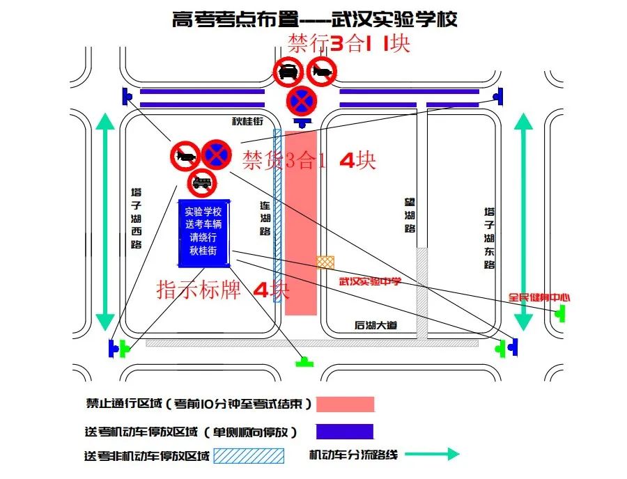 武汉市第十六高级中学周边临时交通管控示意图六、武汉市实验学校:连湖路(秋桂街至后湖大道)每日考前十分钟至考试结束禁止通行,建议按指示标牌绕行塔子湖东路、塔子湖西路。江岸交警建议送考家长及考生乘地铁8号线至中一路站后步行至考点。