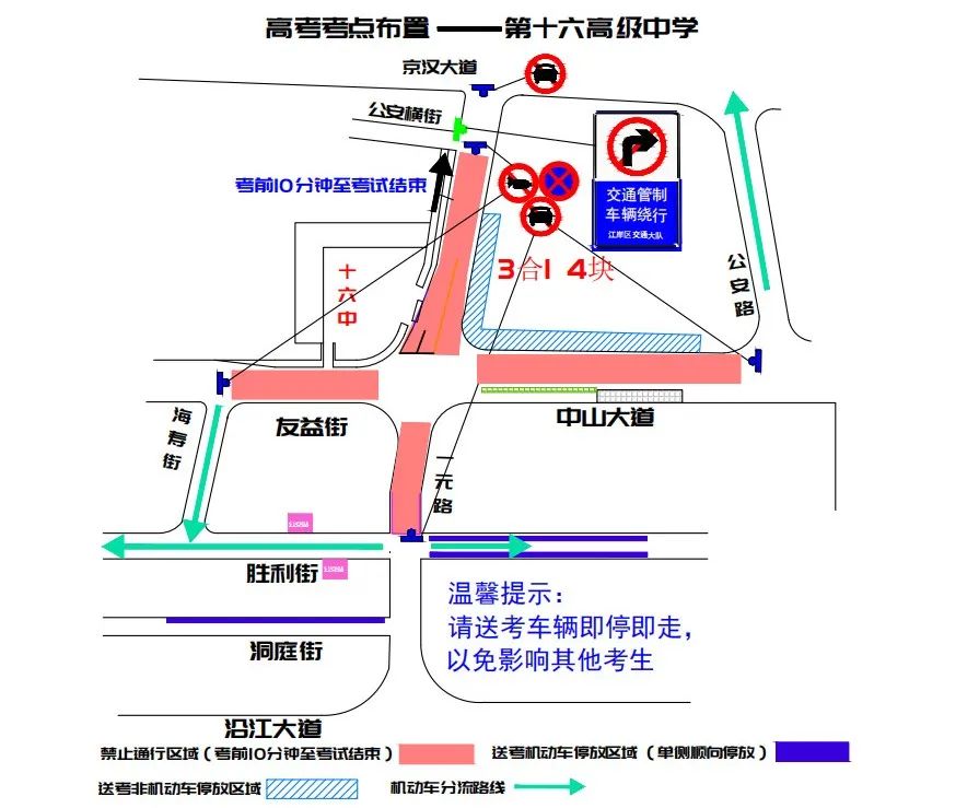 武汉市育才高级中学周边临时交通管控示意图五、武汉市第十六中学:一元路(公安横街至胜利街)、中山大道(海寿街至公安路)每日考前十分钟至考试结束禁止通行,建议绕行京汉大道、沿江大道、胜利街、公安路;一元路胜利街路口、中山大道海寿街口禁停、禁鸣、禁行。江岸交警建议送考家长及考生乘公交到胜利街一元路下车后步行至考点。