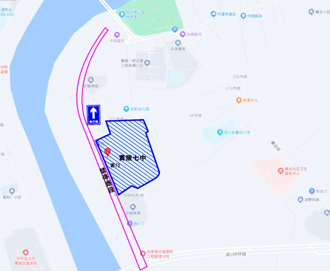 黄陂区第六中学周边临时交通管控示意图三、黄陂七中:考前3天提前开展东堤街沿线停车劝导工作,确保考生进、出考场期间沿线车辆通行畅通。考试期间,接送考生车辆有序、单边停放,校园门前禁止机动车、非机动车停放,确保道路通行畅通。