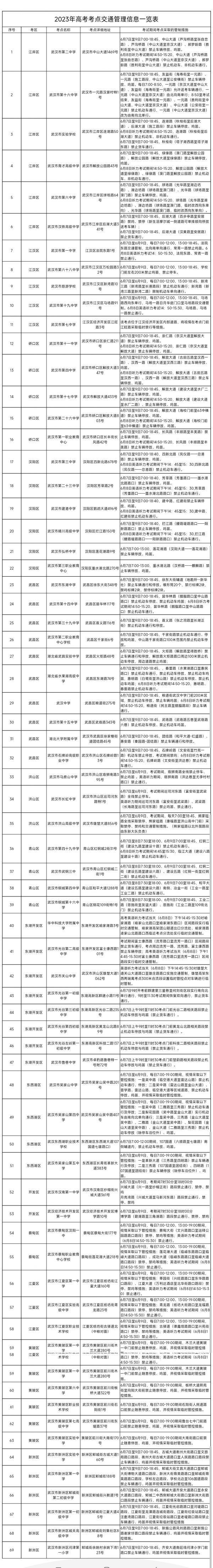武汉新城区的蔡甸区汉阳一中、江夏第一中学、江夏实验高级中学、黄陂区第一中学、新洲区实验中学、新洲区第一中学考生人数均超过1500人,预计考点周边道路因送考车流集中交通压力明显增大。