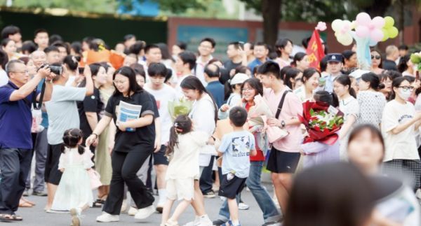 6月9日,我市2024年高考顺利落下帷幕,考生们迈着轻快的步伐走出考场,不少家长手捧鲜花上前拥抱考生,为他们送上祝福。(记者 郑波 摄)