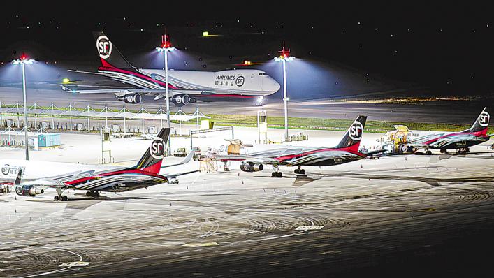 6月2日凌晨拍摄的鄂州花湖国际机场停机坪一角。自2023年4月开通国际货运航线,截至今年6月8日,鄂州花湖国际机场国际货邮吞吐量已突破10万吨。