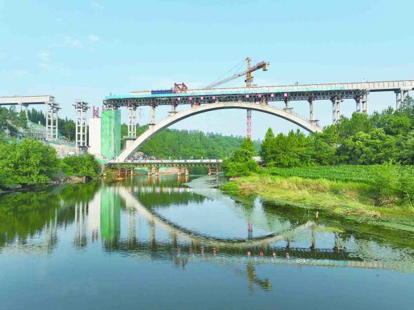 响水洞渡槽于1966年建成,2022年拆除并原址重建。新渡槽总长330米、共26节,渡槽拱圈施工行业内首次采用“大跨混凝土拱式结构转体+支架组合”施工技术。目前,渡槽槽身已完成23节,总体进度约97%,预计6月下旬完成渡槽主体施工。(记者 蒋子龙 摄)