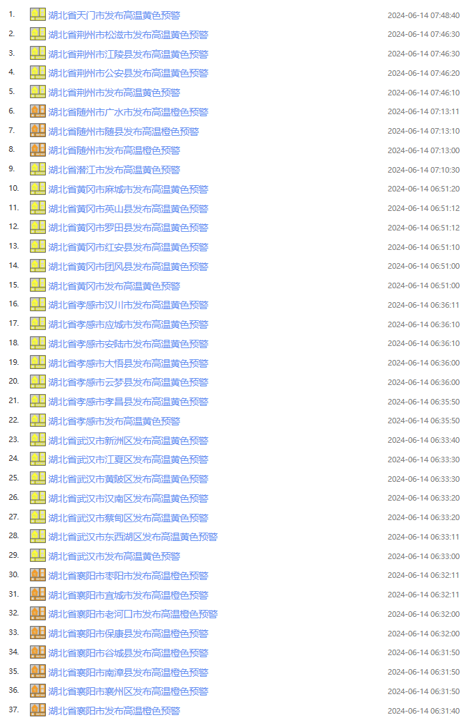 6月14日上午,湖北连发37条高温预警,襄阳、随州多地最高气温将升至37℃以上,局部39℃以上;武汉、孝感、黄冈、天门等地最高气温将升至35℃以上,请注意防范。