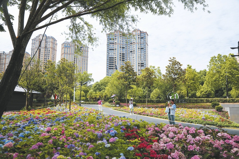 日前,白云湖水环境园林景观提升工程项目二期全面建成开放。该项目位于白云大道临水湖岸,连接已建成的白云湖水环境园林景观提升工程一期项目(滨水八景),西起编钟大桥,东至城市综合体,沿岸依次建设“萍水相依”“宪法广场”“水清墨韵”等景观节点,为市民提供更多的临水游憩活动空间。图为市民在观赏绣球花。(随州日报通讯员聂少峰摄)