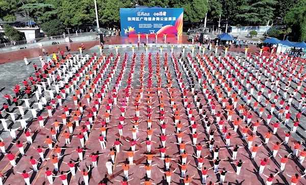 昨日上午,张湾区在市人民广场举行健身舞公益展演活动。千余名热情洋溢的广场舞爱好者和市民齐聚一堂,以矫健的身姿和饱满的精神,共同为即将到来的党的生日和新中国成立75周年献上最诚挚的祝福。图/记者 张建波