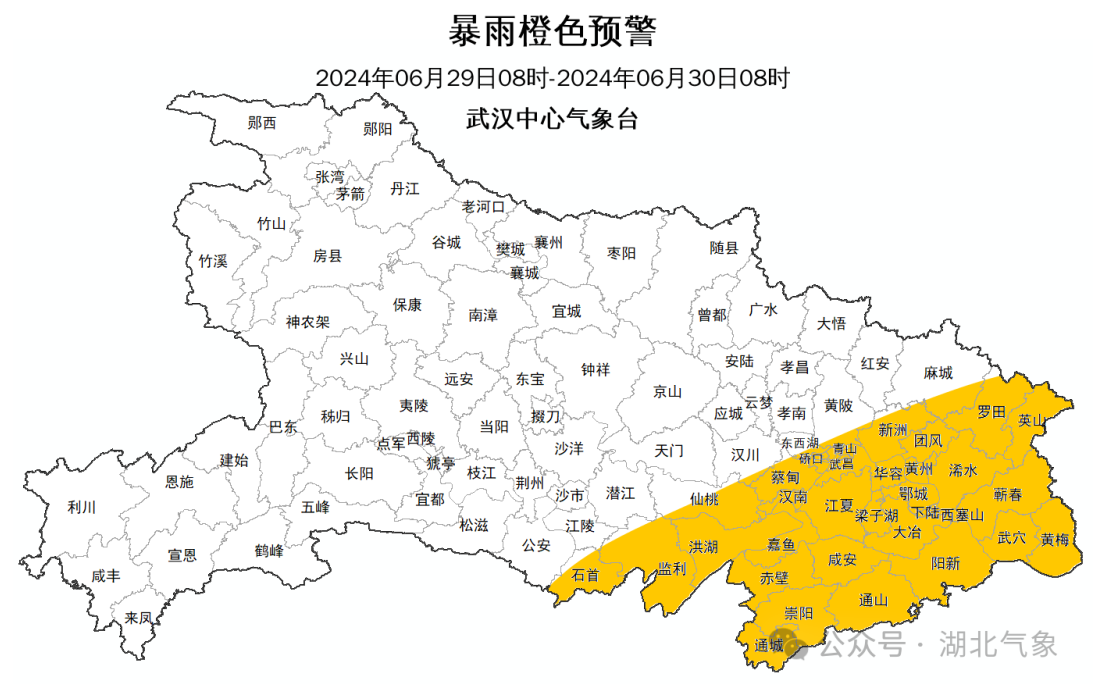 武汉中心气象台2024年6月29日6时45分发布暴雨橙色预警:预计6月29日8时至6月30日8时,荆州东部、仙桃、武汉、黄冈、鄂州、黄石、咸宁等地将有暴雨到大暴雨,请注意防范。