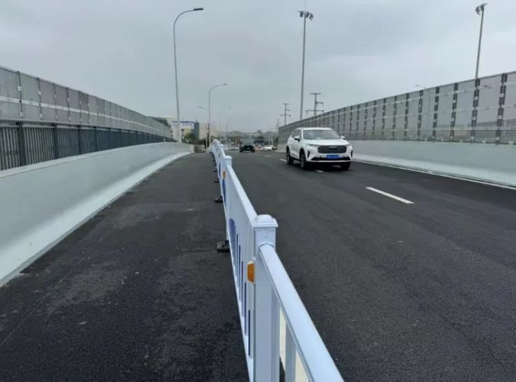 目前该道路主体建设已完工,工人正抓紧安装道路两侧声屏障、桥面护栏,涂刷交通标线,为即将通车做准备。
