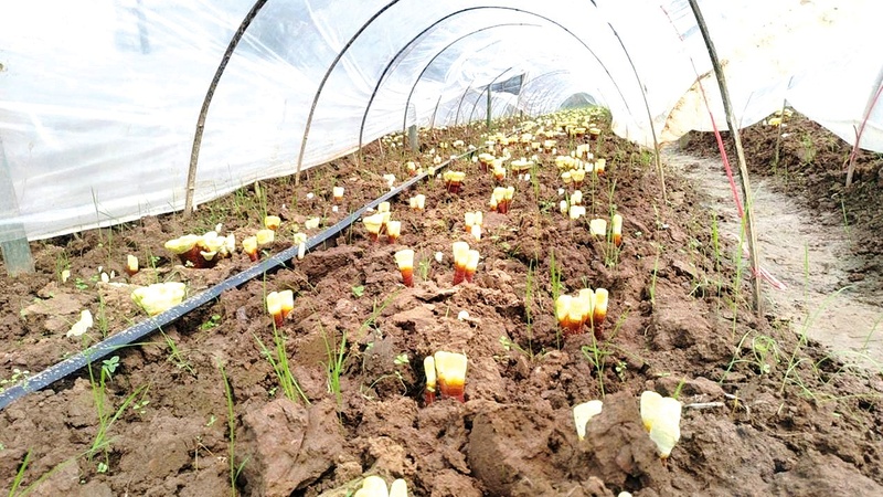 一个个嫩黄色的灵芝菌“冒出头”