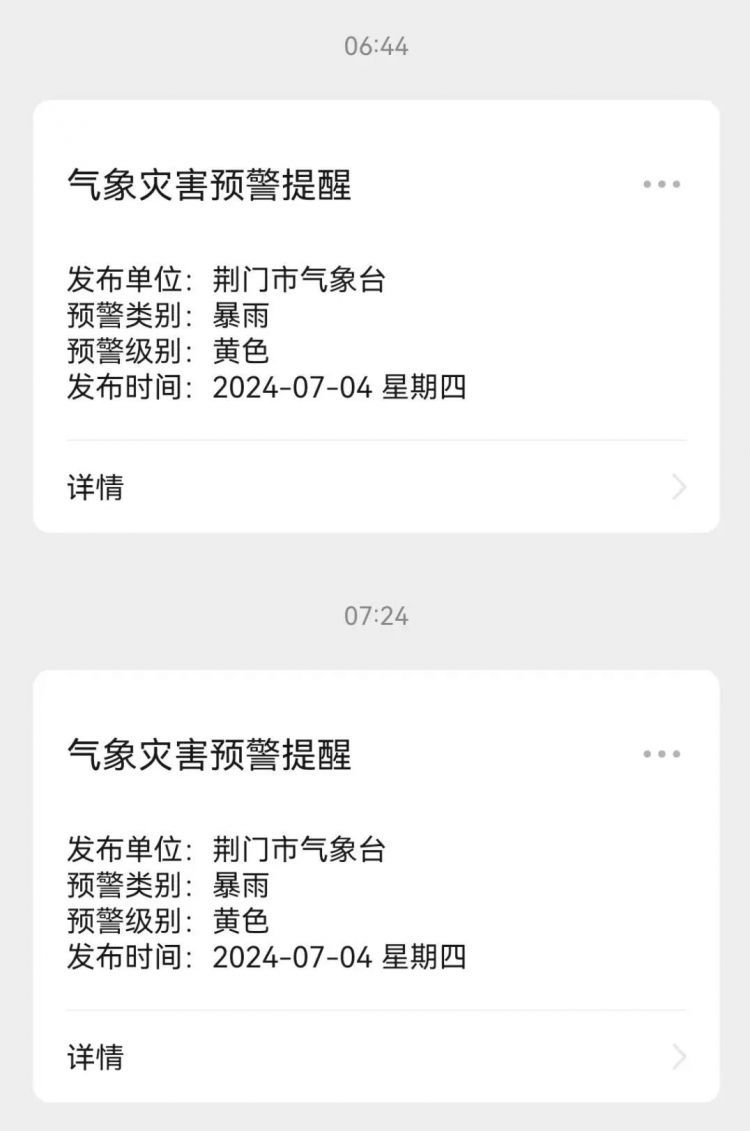 此前,荆门市气象台今晨连发2条黄色暴雨预警。