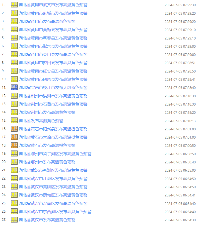武汉中心气象台2024年07月05日07时09分发布高温黄色预警:预计今天白天,武汉、荆州东部、咸宁、黄石、鄂州、黄冈最高气温将升至35℃以上,部分地区37℃以上,请注意防范。