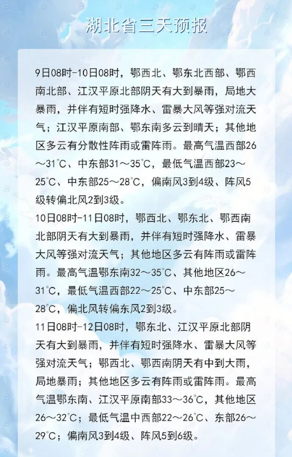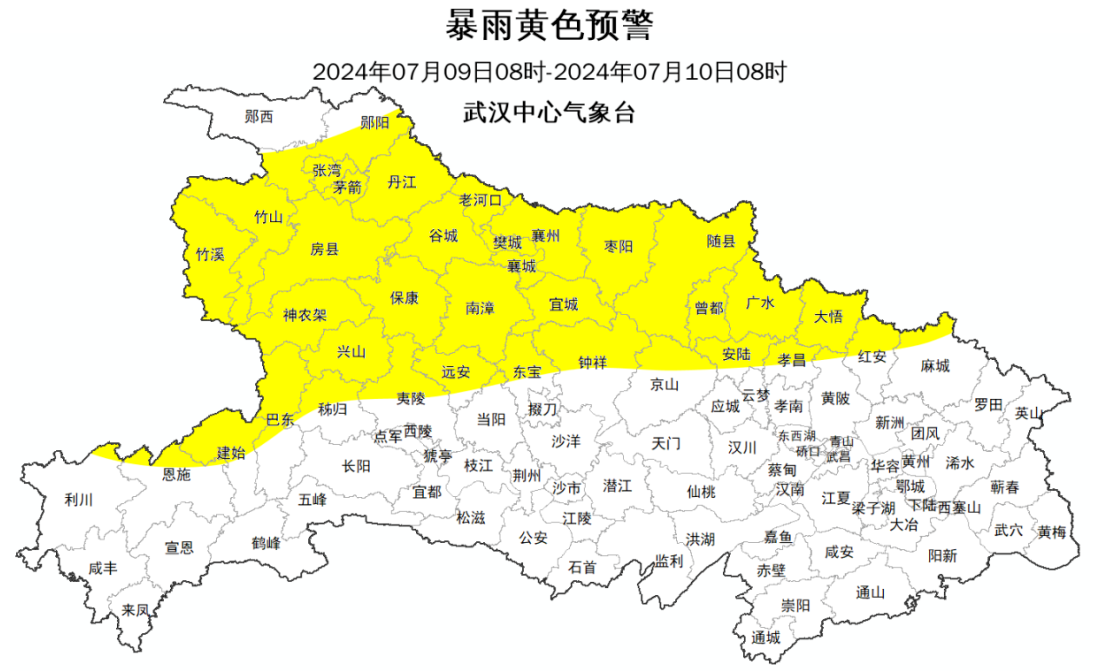 预计7月9日8时至7月10日8时,十堰、襄阳、随州、神农架、恩施北部、宜昌北部、荆门北部、孝感北部、黄冈西北部有大到暴雨,局地大暴雨,请注意防范!
