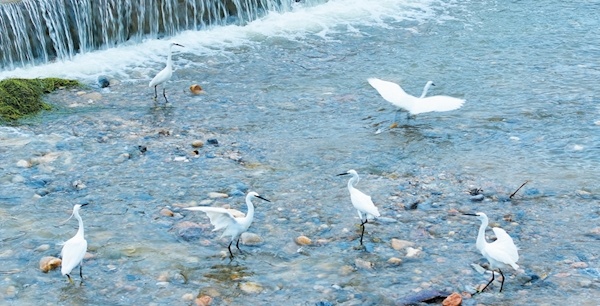7月4日,一群白鹭在房县城关镇马栏河东关社区段湿地觅食嬉戏。