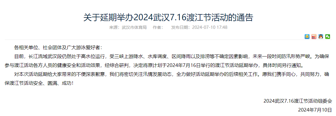 7月10日,武汉市体育局官网发布《关于延期举办2024武汉7.16渡江节活动的通告》。