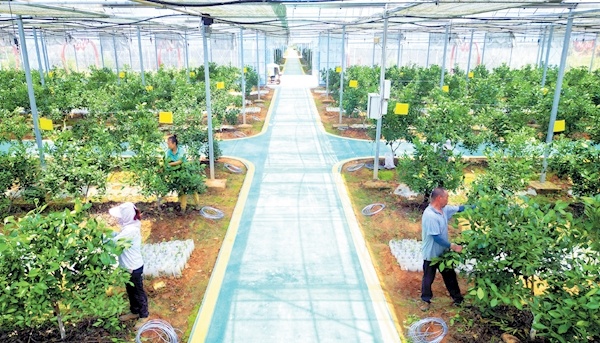 7月22日,丹江口红甘苹智慧农业科技有限公司工人在位于均县镇怀家沟村的智慧橘园里,为已经挂果的高档新品柑橘——“甘平”进行抹尖、拉枝等夏季修剪工作。智慧橘园推广新品种、新技术、新模式,实现种植生产自动化、智能化、标准化,打造集智慧种植、初级加工、品牌电商、农旅融合于一体的全产业链园区。该项目一期总投资近5000万元,占地200亩,已建成19个连栋智慧温室大棚,种植5600多棵“甘平”柑橘。