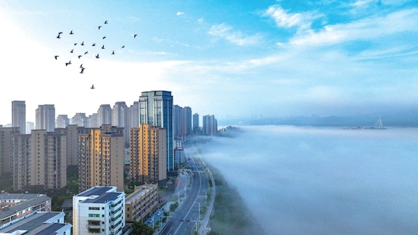 7月22日早晨,南水北调中线工程水源区郧阳区汉江段洪峰过后的江面上薄雾缭绕,建筑远山如笼轻纱,若隐若现,构成一幅美丽画卷。