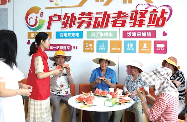 昨日,奥列奥丽西餐厅将近100公斤西瓜和几箱矿泉水送到国瑞里社区户外劳动者驿站,请在这里休息的环卫工、建筑工一起品尝。7月22日,十堰晚报秦楚网全媒体联合“幸福里·十堰社区联盟”成员共同发起“清凉车城”大型公益行动,当天就有一位爱心企业家捐款5000元。此次,奥列奥丽西餐厅购买了2500公斤西瓜,将分别送给户外劳动者和户外执勤交警、消防员、出租车驾驶员等。图/记者 张启国